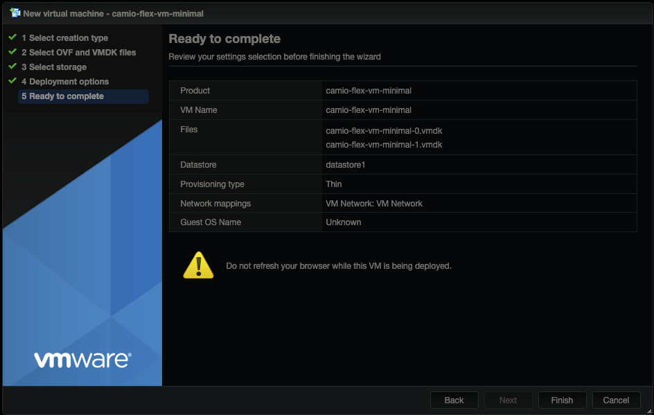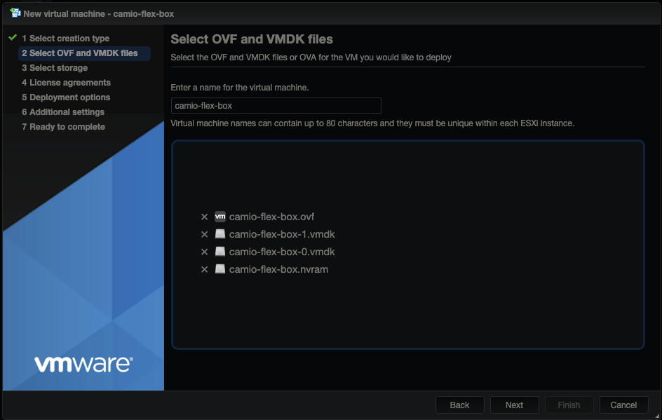 In the file-upload section, upload the camio-flex-esxi-v1.5.0-thick.ovf , camio-flex-esxi-v1.5.0-thick-disk1.vmdk, and camio-flex-esxi-v1.5.0-thick.mf files that were extracted earlier. You do not need to upload the .mf file.