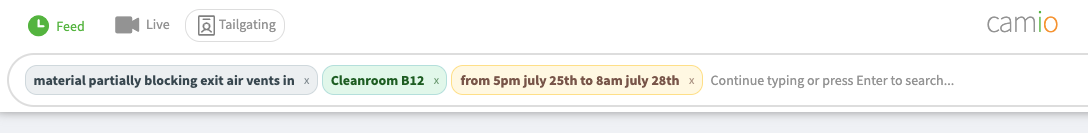 Even though the primary purpose of Camio real-time video search is to detect and alert you to the activities that most warrant human review or intervention (using Event Streaming of activity that's not compliant with your policies), that same search capability expedites historical investigations too.