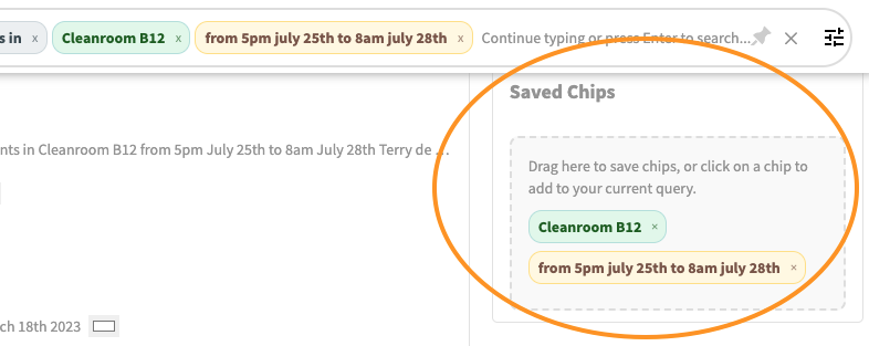 Whenevery you search, the phrases in your query are converted into interactive UI elements, called "chips". For example, this query that's looking for an air flow obstruction over the weekend: