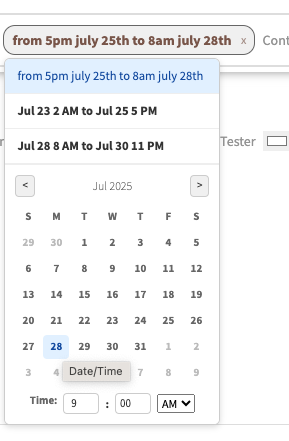 One click on a date/time chip shows a dropdown with related adjacent time windows and a date/time calendar picker.